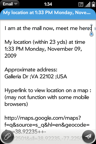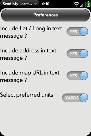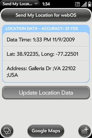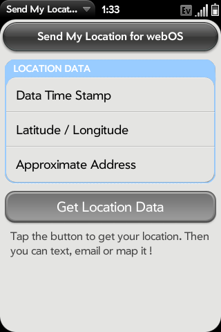 Send My Location for webOS takes existing features of the webOS™ and puts them together to provide a convenient way to let someone know where you are. Making use of the location based services API, Send My Location for webOS retrieves and displays your location information. With a tap you can generate an email or text message with your location info as well as a link to display your location on Google Maps. You can also launch the webOS™ Google Maps App with the position plotted.